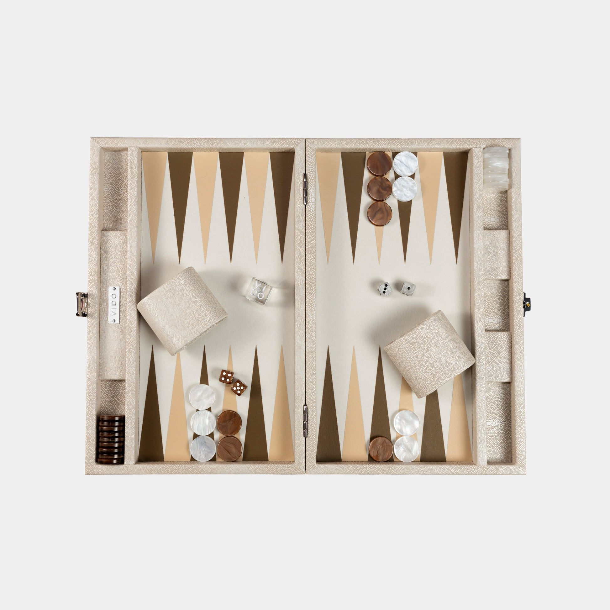 Designed for versatility, the Beige Stingray Medium Backgammon combines a smooth felt playing surface with stingray-textured vegan leather. Its balanced size makes it perfect for both home and travel, while the neutral beige finish delivers refined elegance in a modern, eco-conscious design.